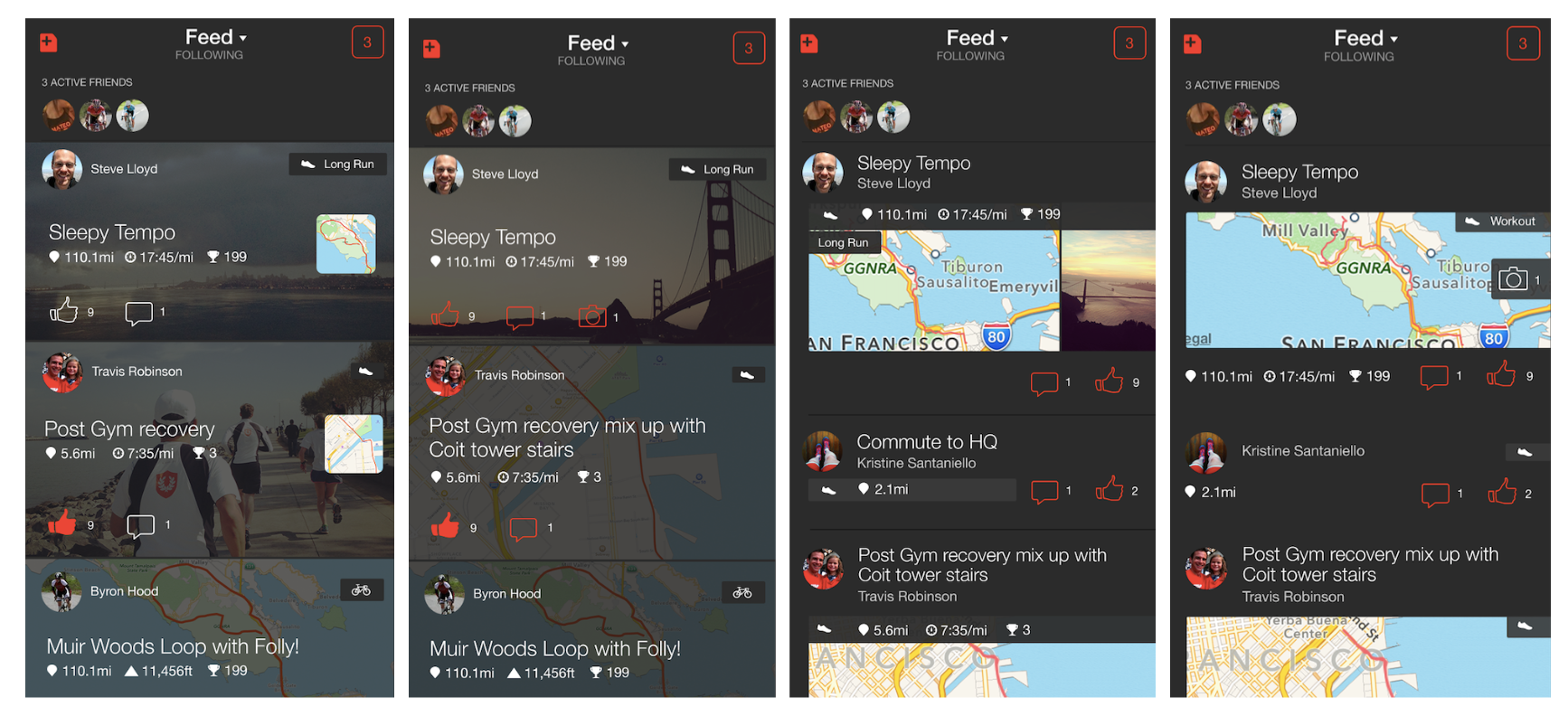 I also conducted a comparative analysis to summarize existing UI patterns and user behavior in other social networks. The goal was to take advantage of lessons learned on interactions and best practices for shared chronological content. One of the problems that we’re trying to solve for our users is giving them the right amount of information at a glance. The interface needs to answer the user’s question if they should dive in and look at someone’s activities in more detail and do they deserve a kudo or comment.