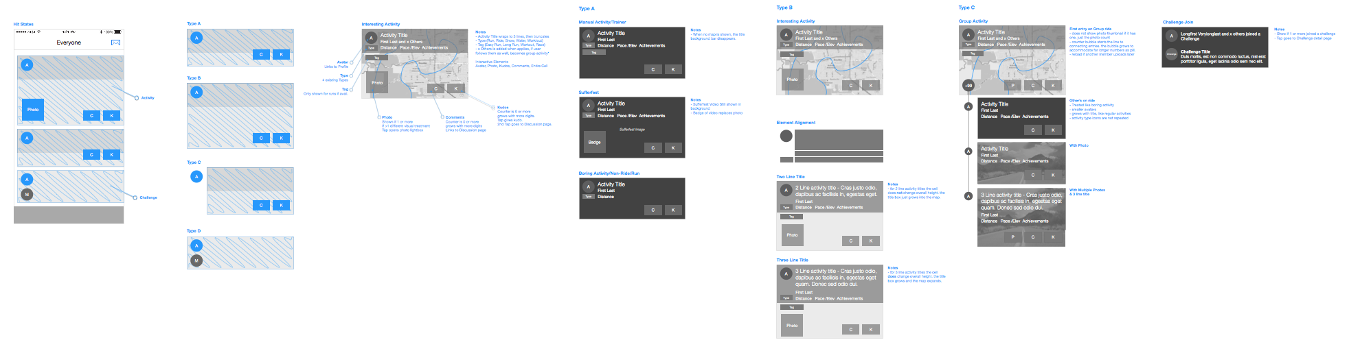 With the research we focused on the most impactful changes to drive engagement with our mobile apps. wireframed concepts and worked close with visual design to get early prototypes in front of users paper and invision prototypes. We tested various combinations of map and photo layouts and new concepts like group rides that collapses similar activities into one. In addition I came up with the idea of treating “simple” activities like collapsed content with the goal to reduce clutter from activities such as commutes.